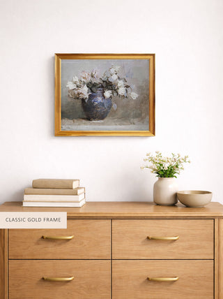 White Floral in a Blue and White Vase by independent artist James Zamora in the Classic Gold Frame