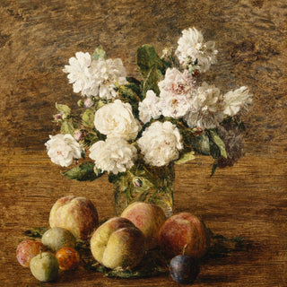 STILL LIFE, ROSES AND FRUITS was originally painted by Ignace Jean Henri Fantin-Latour in 1878. The original artwork, entitled Still Life: Roses and Fruits, is part of a private collection.