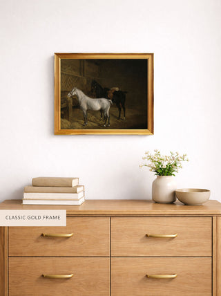 A Grey Pony and a Black Charger in a Stable