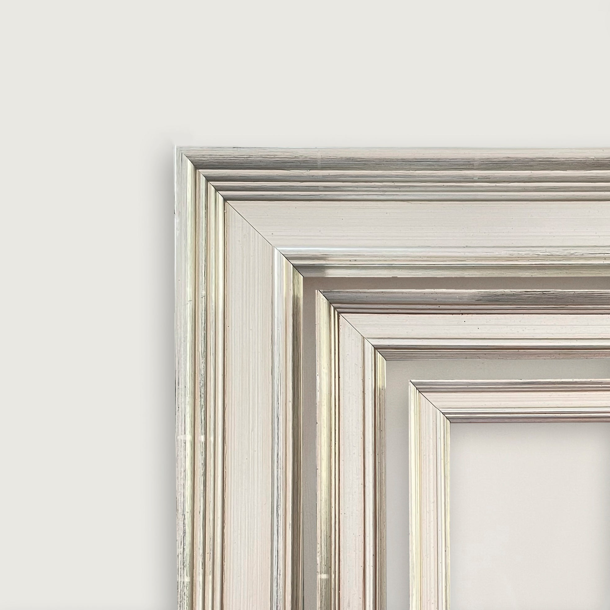 A timeless wood frame style which is leafed and gilded in silver with a subtle satin finish.