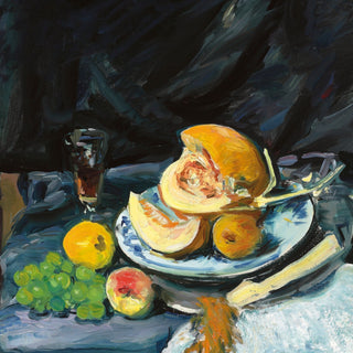 • STILL LIFE WITH CUT MELON, GLASS, AND FAN was originally painted by George Leslie Hunter, c. 1920. The original artwork, entitled Still Life with Cut Melon, Glass, and Fan, is part of a private collection.