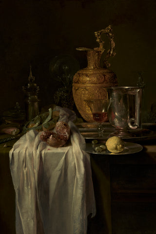 STILL LIFE WITH EWER, VESSELS, AND POMEGRANATE was originally painted by Willem Kalf in the mid-1640s. The original artwork, entitled Still Life with Ewer, Vessels, and Pomegranate, may be viewed at the J. Paul Getty Museum.